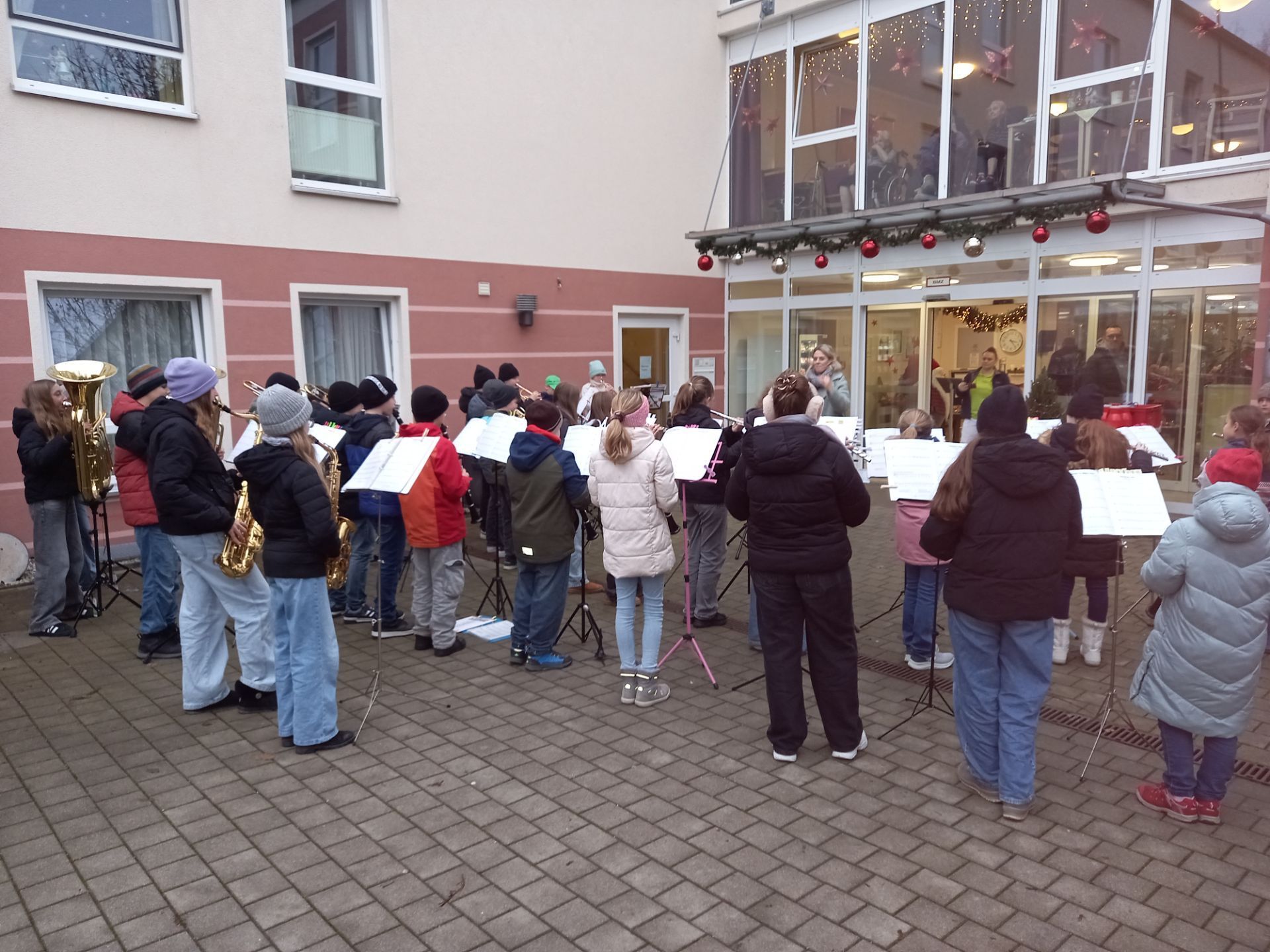 …reichte das Repertoire, das die Bläserklasse 6b für die Bewohner des Senioren-Zentrums St. Johannes-Vitalis in Pfaffenhofen am Samstag, den 13.12.2025, vorbereitet hatte. Das Publikum freute sich besonders über bekannte Weihnachtslieder, die zum Mitsingen einluden, und bedachte die Musikerinnen und Musiker nach jedem Stück mit einem kräftigen Applaus. Im Anschluss an den etwa halbstündigen Auftritt wurden die Schülerinnen und Schüler der Bläserklasse als Dank zu Punsch und Schokolade eingeladen.