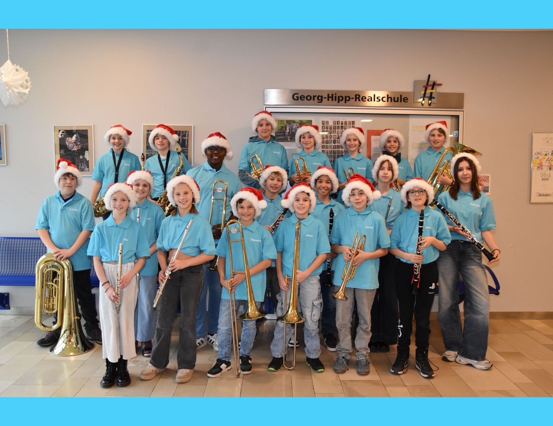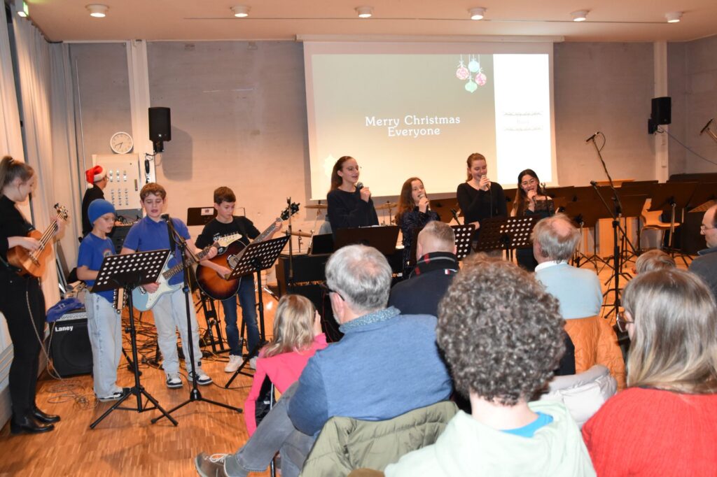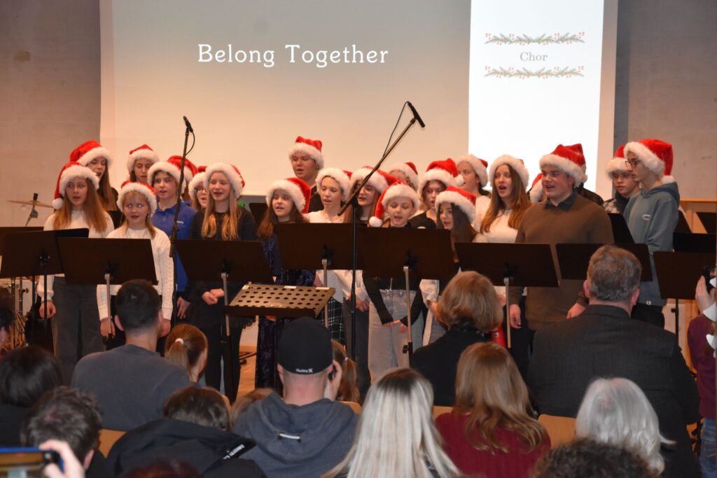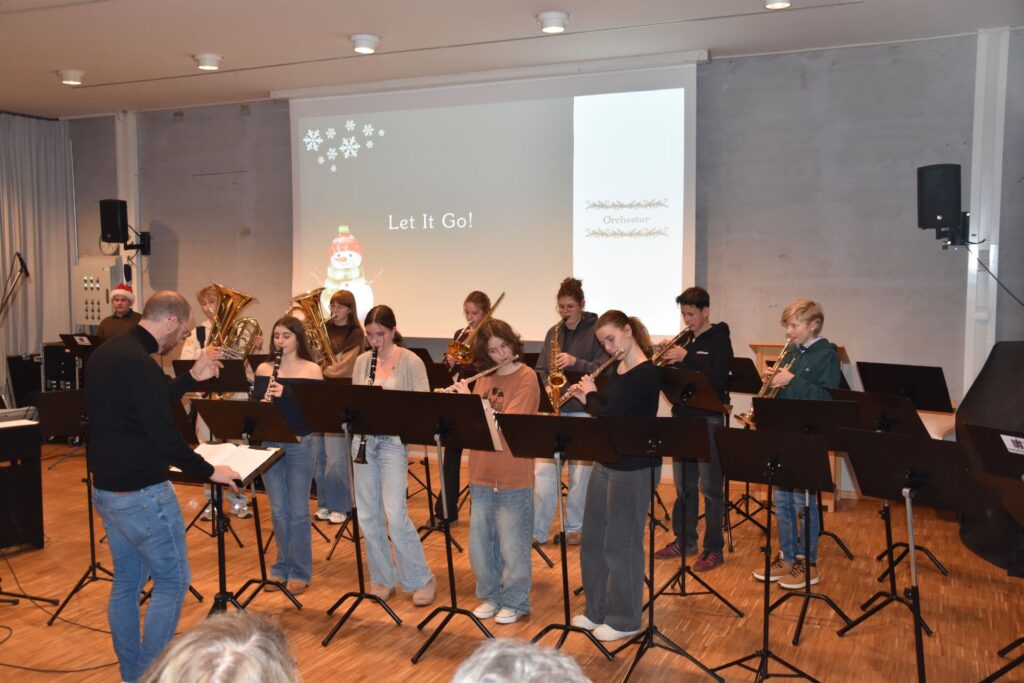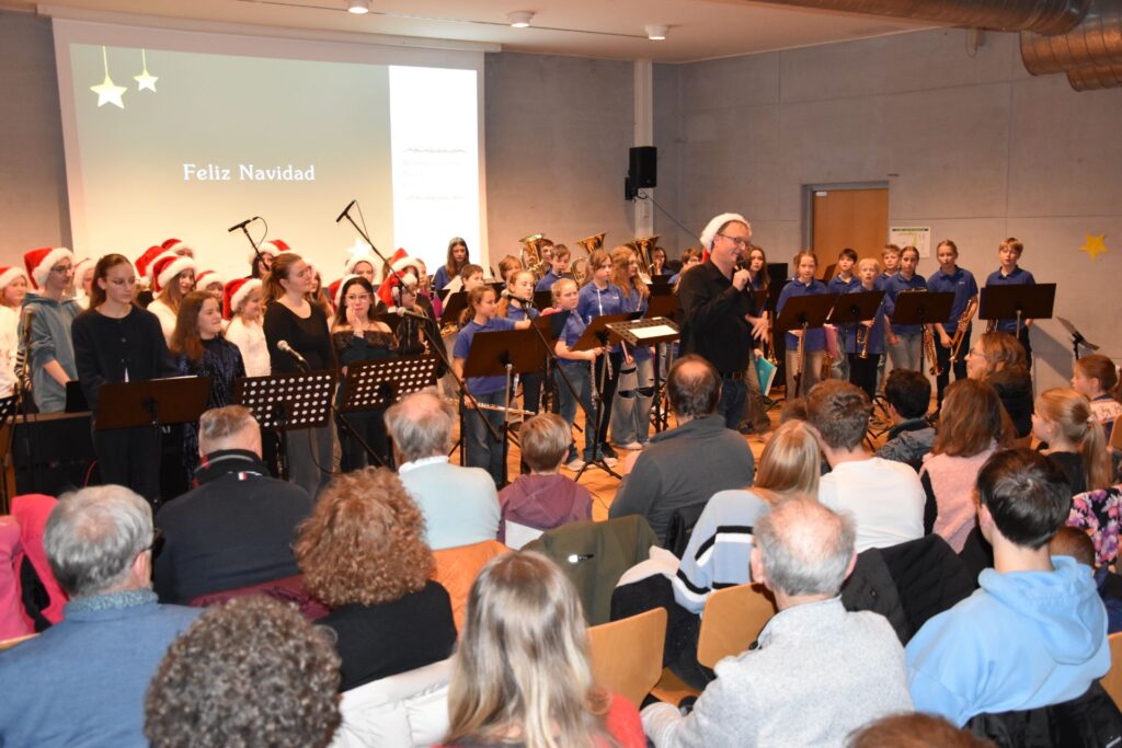 Mit einem sehr kurzweiligen und unterhaltsamen Programm begeisterten die musikalischen Gruppen der Georg-Hipp-Realschule ihre Zuhörer im vollbesetzten Mehrzweckraum. Damit die Zuhörer bei den Stücken „Süßer der Glocken nie klingen“ und „Alle Jahre wieder“, die von der Bläserklasse 6b angestimmt wurden, mitsingen konnten, wurde sogar der Text über den Beamer eingeblendet. Später erwärmte das durch Krankheitsfälle etwas dezimierte Orchester der Schule mit dem Weihnachtsklassiker „All I want for Christmas is you“ die Herzen, die zuvor schon vom Chor mit „Belong together“, dem Lieblingslied der Sänger und Sängerinnen, geweitet wurden. Tobias Brunthaler las mit trockenem Humor, den passenden Pausen und im bayerischen Dialekt die Geschichte „Dresscode unterm Weihnachtsbaum“ und sorgte damit für viele Lacher und Schmunzler im Publikum. Stimmgewaltig mit fünf Sängern präsentierte die Schulband weitere Weihnachtsklassiker wie „Merry Christmas everyone“, bevor sich dann zum Schluss alle ca. 80 Sänger und Musiker vorne versammelten, um mit „Feliz navidad“ den Abend fulminant zu beenden.