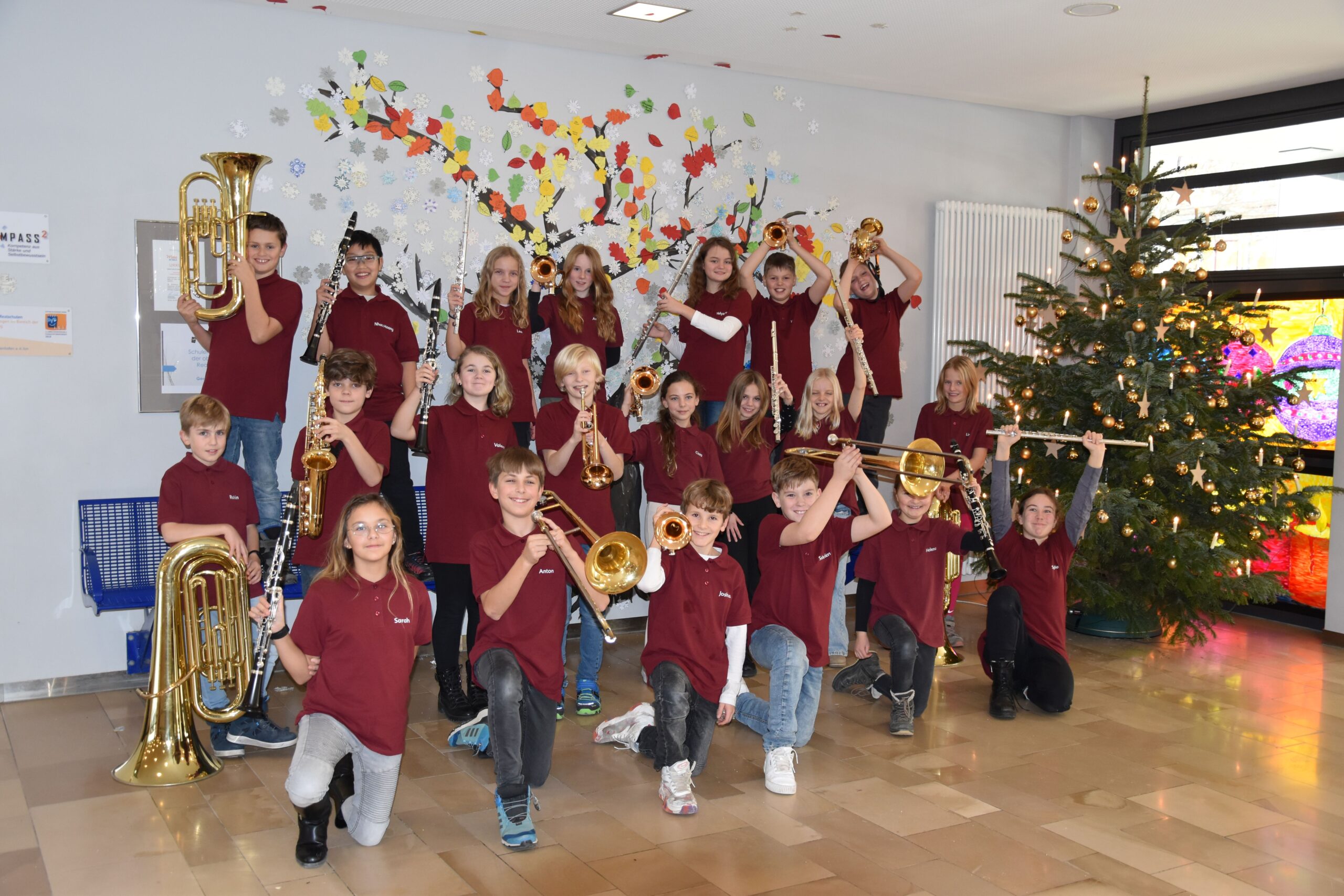 Für die Bläserklasse 5b war die Woche vor den Weihnachtsferien eine sehr ereignisreiche Zeit: Zuerst gab es ein vorgezogenes Weihnachtsgeschenk: Die Bläserklassenshirts waren an der Schule angekommen und konnten verteilt werden. Wir bedanken uns ganz herzlich bei der Firma Hipp, die uns jedes Schuljahr die Bläserklassenshirts zur Verfügung stellt!