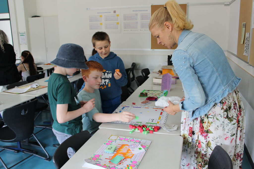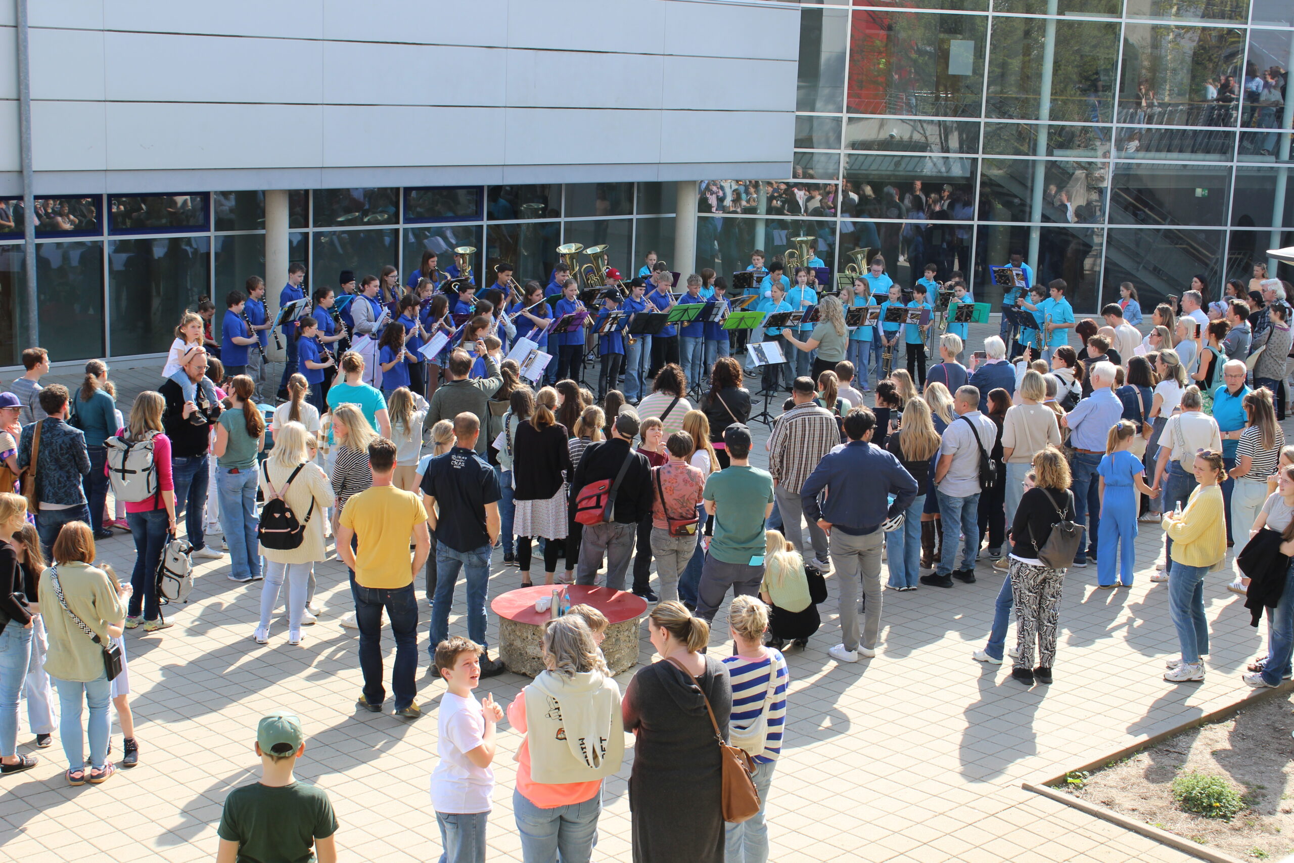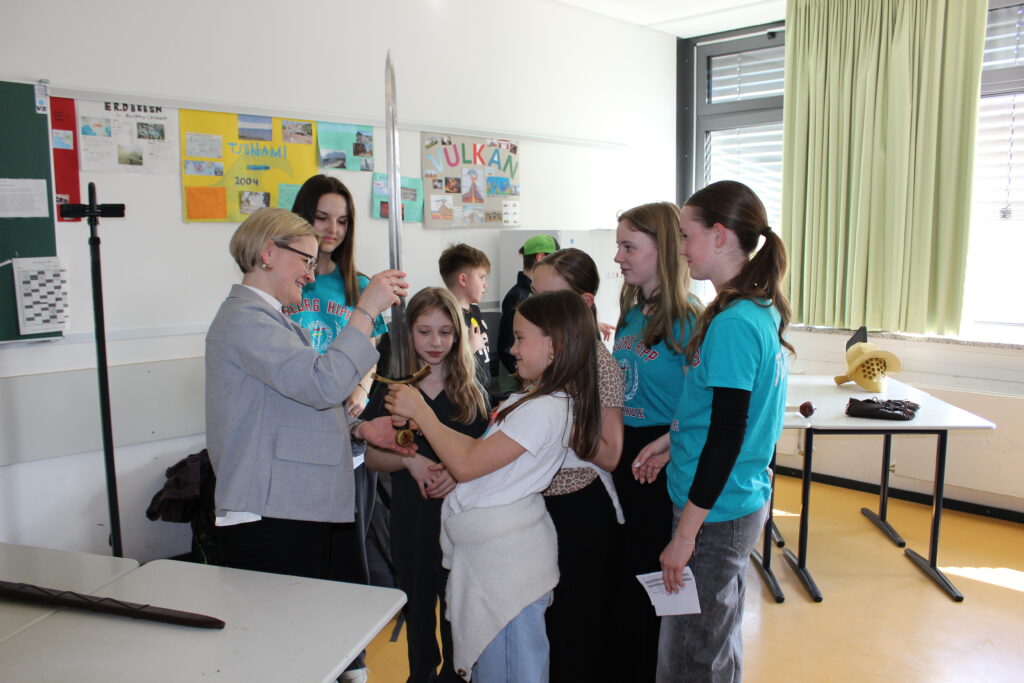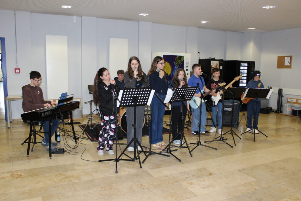 Als sich um 14 Uhr die Türen der Realschule öffneten, begrüßte die Schulband die ersten hereinströmenden Besucher in der kleinen Aula mit ihren fetzigen Songs. Um den am Übertritt interessierten Viertklässlern und ihren Eltern das Schulhaus zu zeigen und was sie so in den einzelnen Fächern erwartet, waren vom Keller bis zum dritten Stock einzelne Klassenzimmer und Fachräume geöffnet und mit Schülern und Lehrern besetzt. Zwischendurch konnte man Einstein und Newton – alias Frau Wittmer und Herr Siebler – im Gang vor der Aula treffen, die zur Physik-Show eingeladen haben. Oder man wurde von einem römischen Legionär zum Geschichtszimmer im dritten Stock geleitet. Was man im Werkenzweig alles zu den einzelnen Werkstoffen bauen kann, war im Werkenraum ausgestellt, wo mit einem 3D-Drucker auch Einkaufschips mit Namen angefertigt wurden. Geschicklichkeit und Kraft waren beim Ninja-Warrior-Parcours in der Sporthalle nötig. Bei anderen Fachschaften konnten sich die Jugendlichen mit thematischen Aufgaben beschäftigen und vieles ausprobieren. Auch die Wahlunterrichtsgruppen im Schulleben wie Schulsanitätsdienst, Tutoren, Lerntutoren oder das Schulkleidungsteam waren mit Infoständen oder Vorführungen vertreten. Und wer vor oder nach der Infoveranstaltung für die Eltern der Viertklässler im Mehrzweckraum noch Fragen hatte, fand in der Aula die ganzen Beratungsangebote. Während der Infoveranstaltung für die Eltern, in der über die Wahlzweigprofile, Übertrittsbedingungen, die Bläserklasse und noch viel mehr aufgeklärt wurde, wurden die Viertklässler von Tutoren in kleineren Gruppen durchs Schulhaus geführt. Für das leibliche Wohl sorgten der Elternbeirat und die SMV. Mit einem Konzert der beiden Bläserklassen auf dem Pausenhof und einer Vorführung der Tanzgruppe fand der Tag der offenen Tür langsam seinen Ausklang.