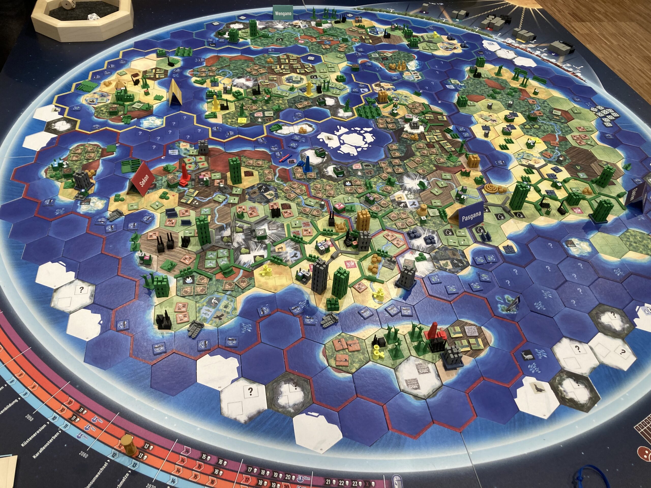 24 engagierte Spieler – Lehrkräfte, Schüler, Stadtmitarbeiter und weitere Gäste – versammelten sich um ein ungewöhnliches Spielbrett von 1,55m x 1,55m Größe, um die Welt vor der drohenden Klimakatastrophe zu retten. Ziel des Weltklimaspiels ist es, durch gemeinsames Handeln und strategische Entscheidungen eine nachhaltige Zukunft zu gestalten. Um dies zu erreichen, mussten die Teilnehmer u.a. als Staatspräsidenten, Firmenchefs oder Mitglieder der Zivilgesellschaft miteinander verhandeln, Kompromisse eingehen und gemeinsame Ziele entwickeln, da das Spiel großen Wert auf Kooperation und Kommunikation legt.