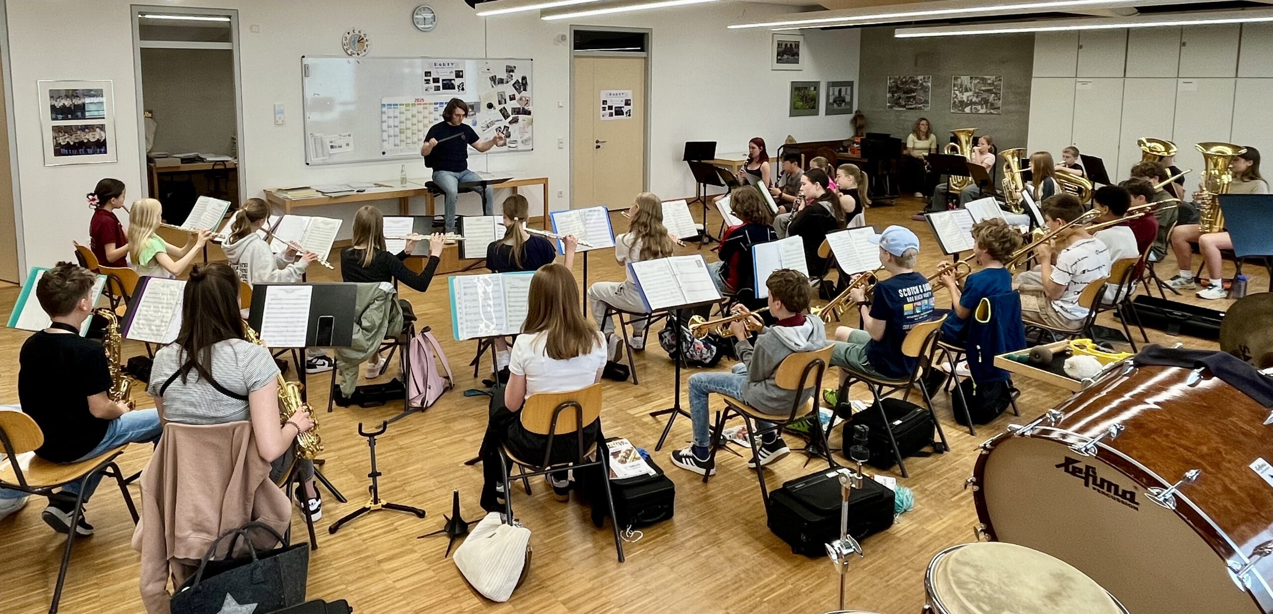 Die musikalische Leitung des Probentags übernahm Adrian Knoll, Dirigent der Jugendstadtkapelle. Mit viel Engagement und musikalischem Gespür erarbeitete er gemeinsam mit den Jugendlichen ein abwechslungsreiches Programm für den Auftritt beim Neubürgerfest am 18. Mai 2025 um 14 Uhr im Bürgerpark Pfaffenhofen. Neben der Probenarbeit kam auch das Miteinander nicht zu kurz: In der Mittagspause wurden die Kinder mit Pizza und Getränken versorgt – organisiert und finanziert von der Stadtkapelle, die sich seit Jahren stark für die musikalische Jugendarbeit einsetzt. Das Projekt zeigt eindrucksvoll, wie erfolgreich die Zusammenarbeit zwischen Schule, Musikschule und Verein gelingen kann.