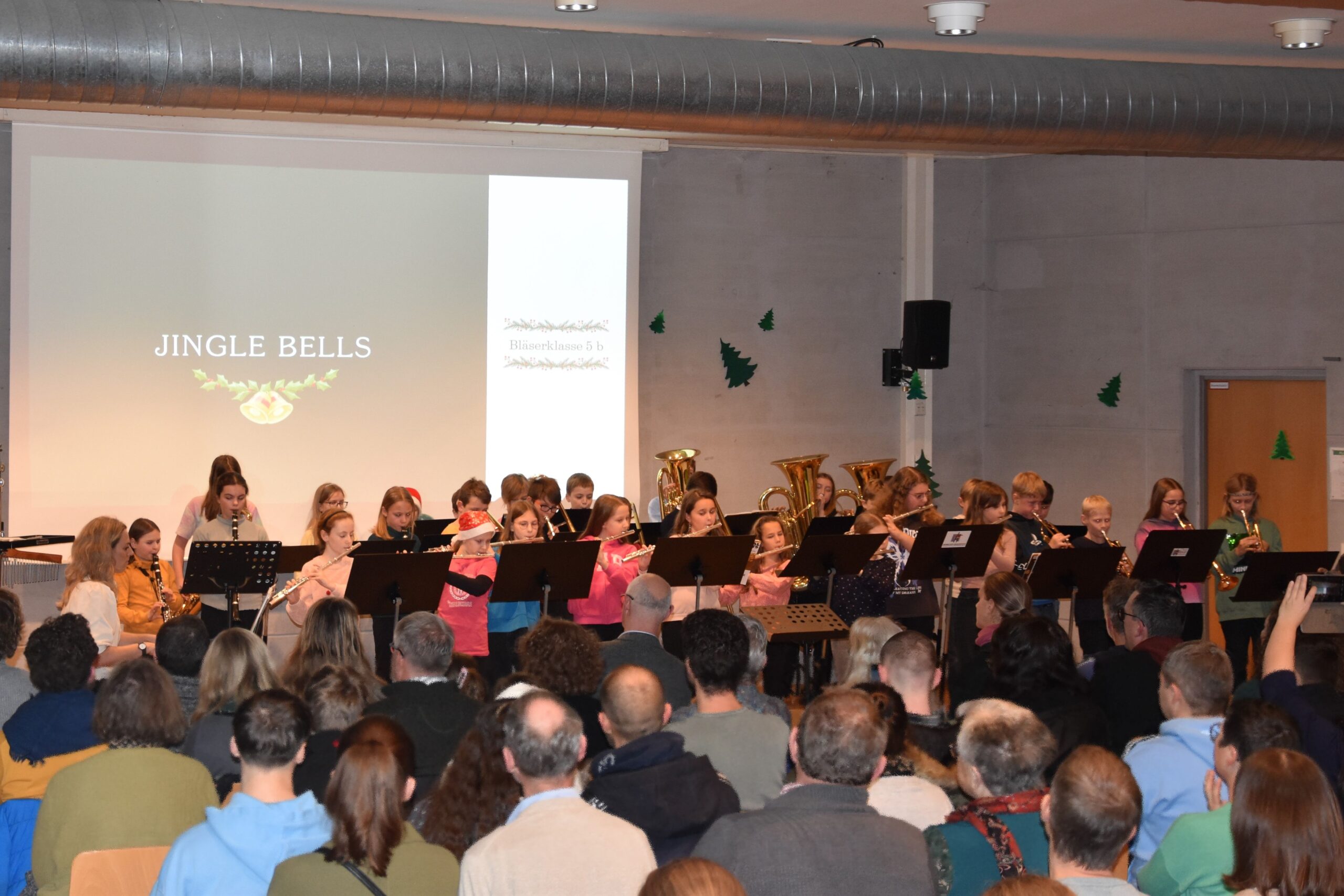 Die beiden Bläserklassen 5b und 6b, der Schulchor und die Schulband hatten ein abwechslungsreiches weihnachtliches Programm einstudiert, das von traditionellen Weihnachtsliedern, bei welchen auch mitgesungen werden durfte, bis hin zu Klassikern aus der Popmusik reichte.